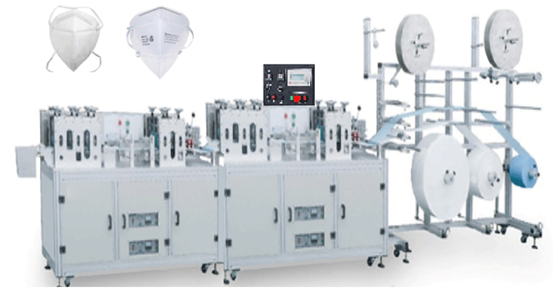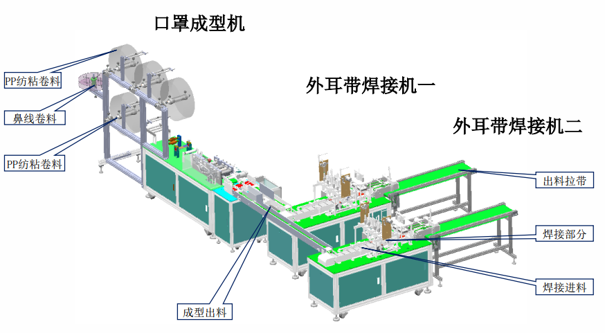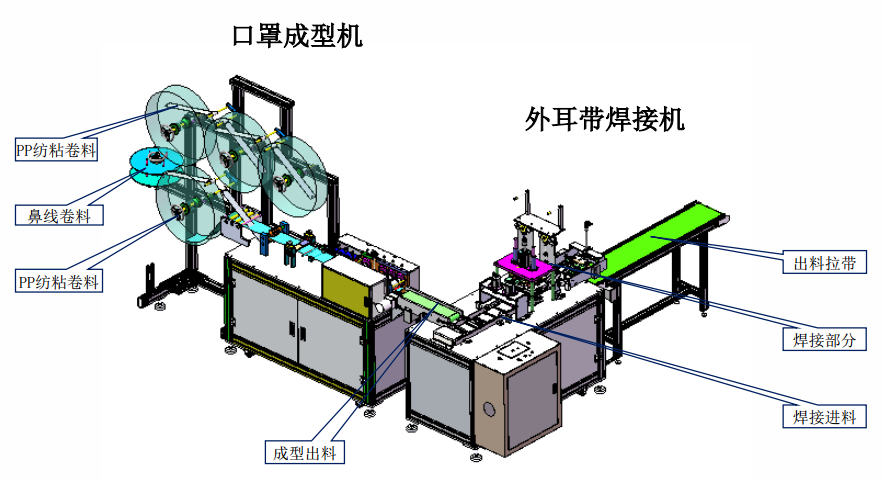 本設(shè)備主要生產(chǎn)平面口罩,由口罩成型機(jī)和外耳帶焊接機(jī)組成。從原材料卷料自動送料、鼻線插入、截斷、超聲波熔合、口罩自動裁斷、耳帶上料及焊接等均全自動完成。